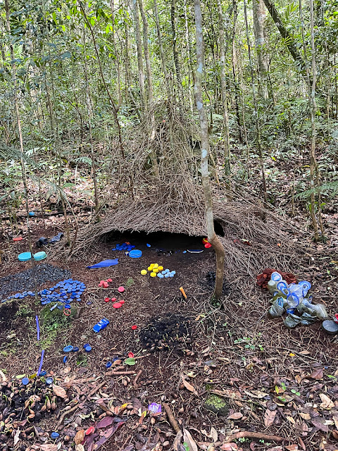 The action was over by 9:30 and the male had moved off into the forest to feed and rest and whatever else parotias do to occupy their time. Not too far away was the bower of a male Vogelkop Bowerbird, this also with a permanent blind. Bowerbirds are a family of birds from Australia and New Guinea. The male constructs an elaborate bower, or structure usually made from twigs and dried grasses. Each species builds a specific shape for the bower unique to that species. He then adorns his bower with colorful objects arranged in specific patterns. Females determine the suitability of the male based on his bower construction and the decorations. In the old days the decorations would colorful berries, flowers, and the like, but these days plastic items seem to be much more popular. At this bower, our bird favored blue, yellow and red bottle caps, along with other plastic items including a toy car. Bowerbirds are never satisfied with the arrangement of their decorations and are constantly moving things around. When we arrived at the blind he wasn't in attendance of the bower, but it wasn't long after we settle in that he flew in. I think he knew we were there but is conditioned to having birders in the blind. I've included a video below that shows him going about his tasks.