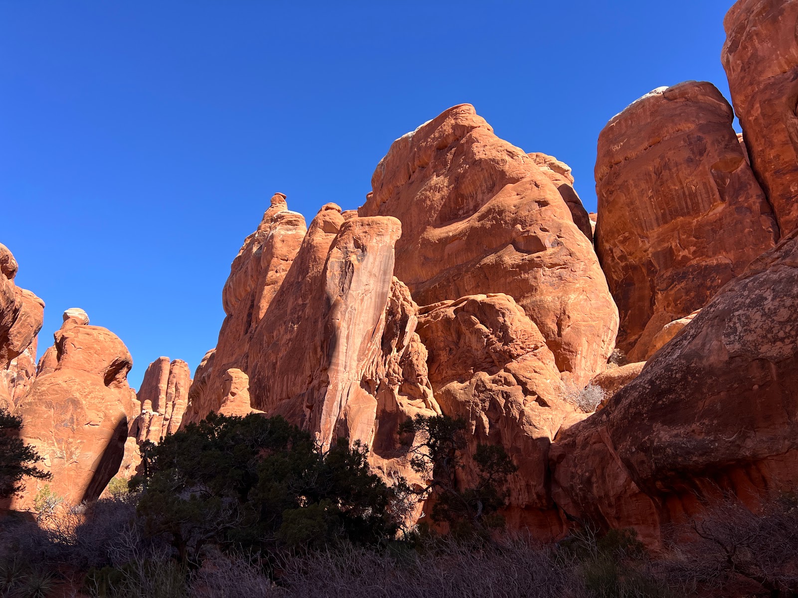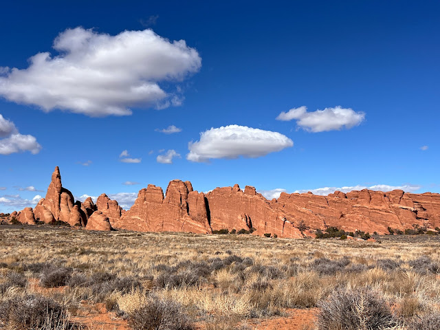 We got an early start to our Fiery Furnace hike day. In fact, we were the first ones there. Nice. Very nice. With the early start it was a couple hours before we even saw another soul. Even nicer. If you do this hike, the park service really wants you to go on their ranger guided version, rather than on your own. Their version is two and a half miles in two and a half hours. We doubled the distance and time. We had a marvelous morning of exploration. We meandered, lots of fabulous sights to see, and plenty of pointless dead ends. We had lunch with a view. We saw a handful of other people all day long. Some of them were running through the area from arrow to arrow like it was a competition, and you got a prize if you finished fastest. How sad is that. Oh well, you do you. This is the Bob and Susan version.