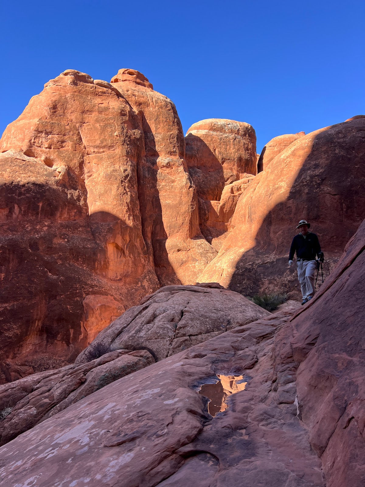 Should you do this hike? For the average visitor to Arches, the answer is NO, definitely not. The park service has put up numerous arrows, but based on things we read on-line, the average hiker seems to have problems following basic directions and spends a great deal of time being lost. Even with the ranger to show the way, it is too physically demanding for most folks. The hardness factor involves lots of climbing up and sliding down. I spent a far amount of time on my butt sliding along, and had a couple of airy not happy spots. We thought this was the funnest hike in the park, but we spend our days getting cliffed out and having to backtrack. And we only hike on trails when we have to.
