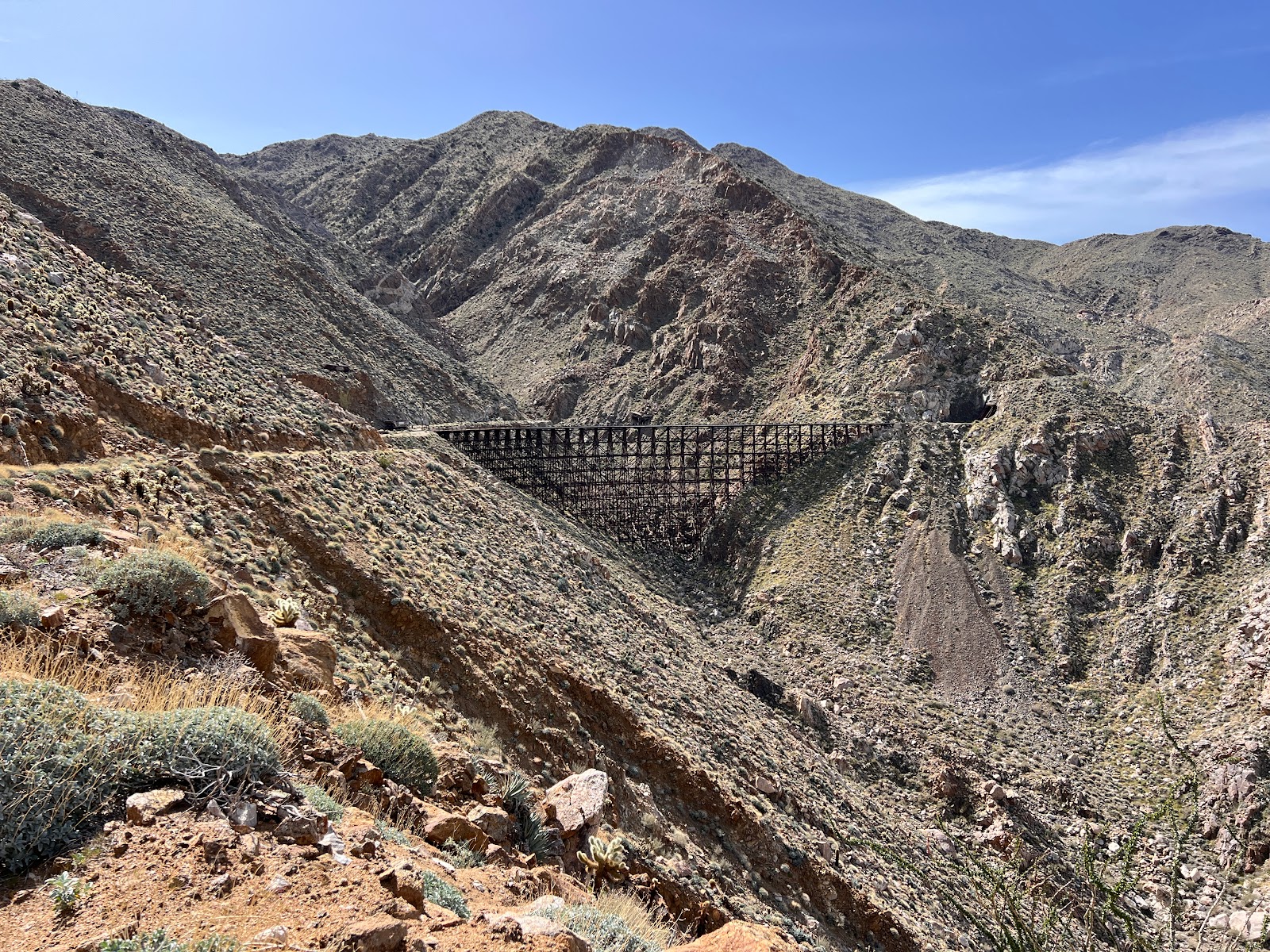 What is the appeal? Goat Canyon trestle is the largest all wooden train trestle. According to Wikipedia link it is 597-750 feet long. The San Diego and Arizona Eastern Railway line was completed in 1919. It was called the impossible railway due to all the tunnels and trestles that had to be built through the mountainous terrain. Goat trestle was started in 1932 and finished in 1933. It had to be built to replace a tunnel that collapsed during an earthquake. Redwood was used for the trestle due to the extreme temperature variations. It is one of a kind.